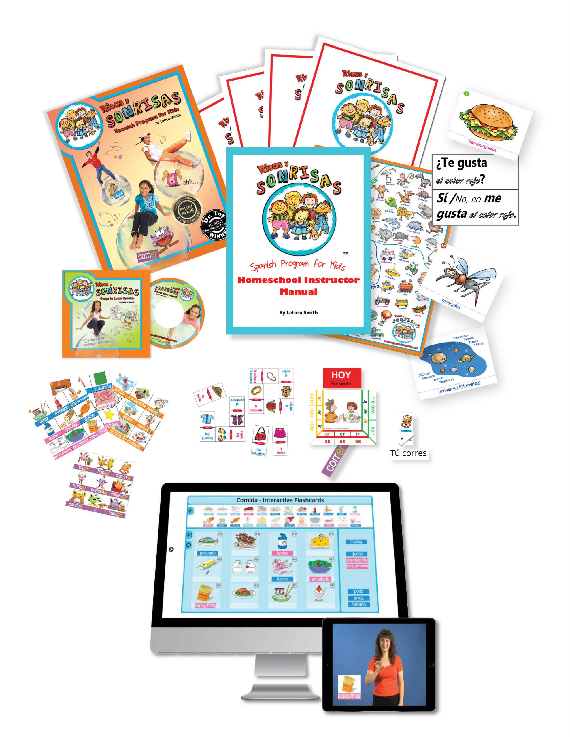 Themes included: Pronunciation, Colors & Shapes, Emotions & Greetings, Body, Directions, Numbers, Family, Opposites, Wild Animals, School, Calendar (Days, Months, Seasons, Holidays), Time, Verbs, Personal Pronouns, Food & Set the Table, House, Places, Occupations, Clothes, Farm Animals, Gender (Masculine/Feminine), To Be (Ser, Estar, Tener), Additional Songs (Questions, Magic Words, etc.)